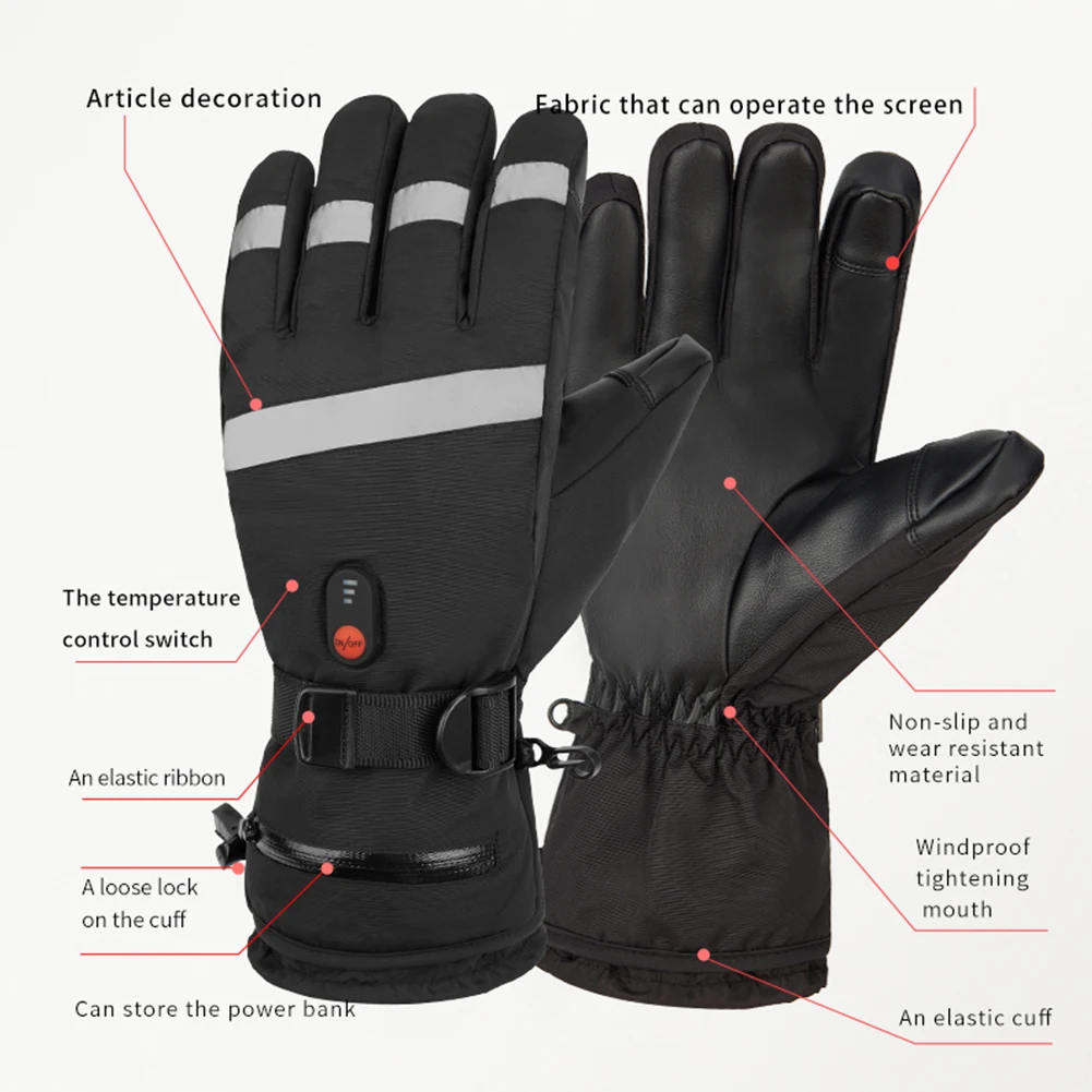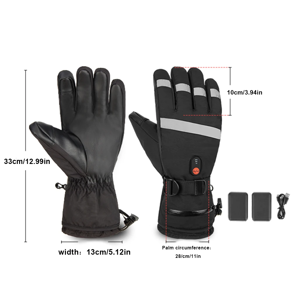 Electric Heated Gloves Waterproof Motorcycle Winter Moto Heated Gloves Skiing Motorcycle Cycling Gloves for Snowboard Cycling Motorcycle Ski Outdoor Feature: 1.Ultimate Warmth: These electric heated gloves are designed with a plush, warm lining that provides exceptional insulation. This feature ensures that your hands remain comfortably warm even in the most severe cold weather conditions, allowing you to enjoy outdoor activities without discomfort. Specification: Origin: Mainland China Fabric: PU fabric Lining: Fleece lining Temperature: 40-65°C Size: 33*13cm Note: