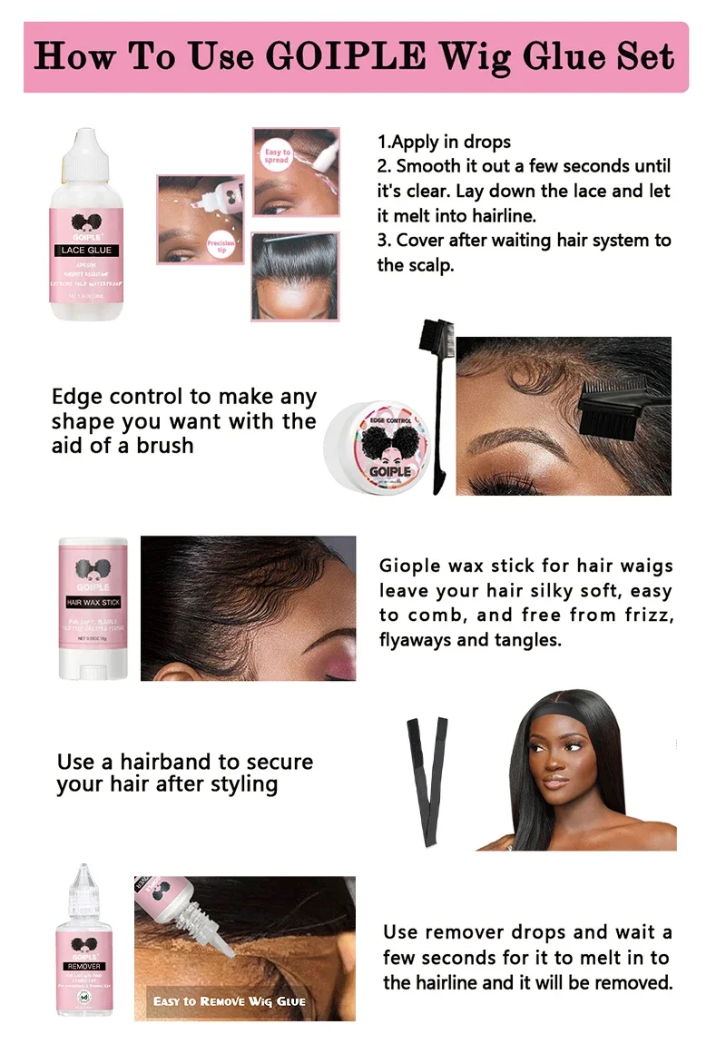 2.7oz Lace tint spray + 1.34 oz wig glue + 1oz wig glue remover + 0.56oz hair wax stick floral scent + 1oz edge control + satin edge scarf + edge control brush